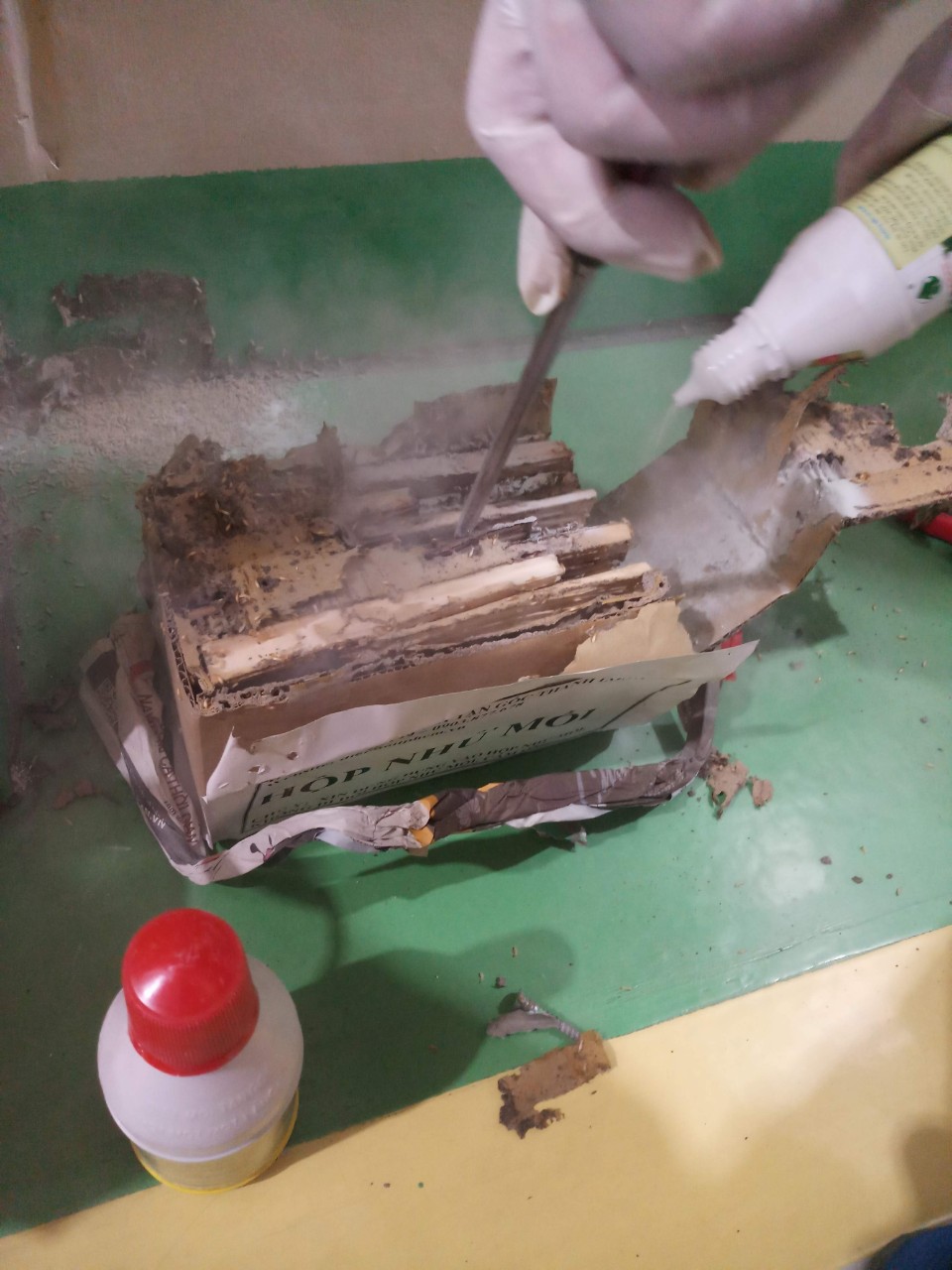 Sau khi đặt hộp nhử mối từ 12-15 ngày tiến hành kiểm tra nếu thấy xung quanh hộp nhử mối có nhiều đường mối ăn thì lúc đó mối đã nhiều trong hộp. Trước tiên mở hộp nhử mối ra, đổ hết những miếng mồi nhử và những con mối trong hộp nhử vào một cái chậu khô, sau đó dùng thuốc bột PMC90 phun đều lên những con mối và bề mặt miếng mồi rồi sau đó xếp những miếng mồi vào lại hộp nhử (cả những con mối) đặt hộp nhử vào đúng vị trí ban đầu 4-6 ngày sau mối đã rút hết về tổ để lây nhiễm, tiêu diệt được hệ thống mối ngầm và mối chúa thì tiến hành dọn bỏ hộp.